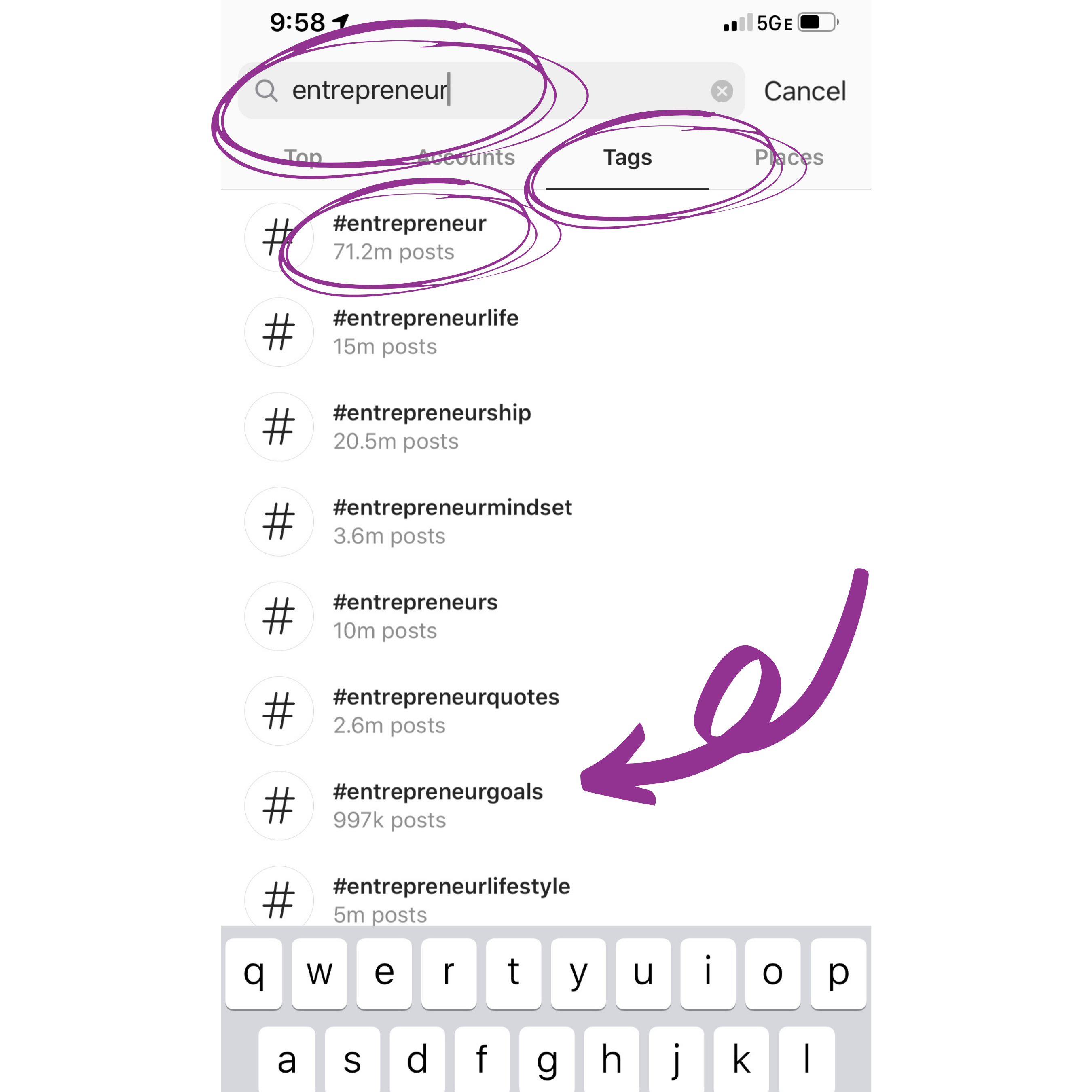 2. Don't use general and big hashtags like Entrepreneur or Fashion (71M reach), because your post will get lost in the sea of content. Instead check which other options Instagram is providing you with smaller reach.