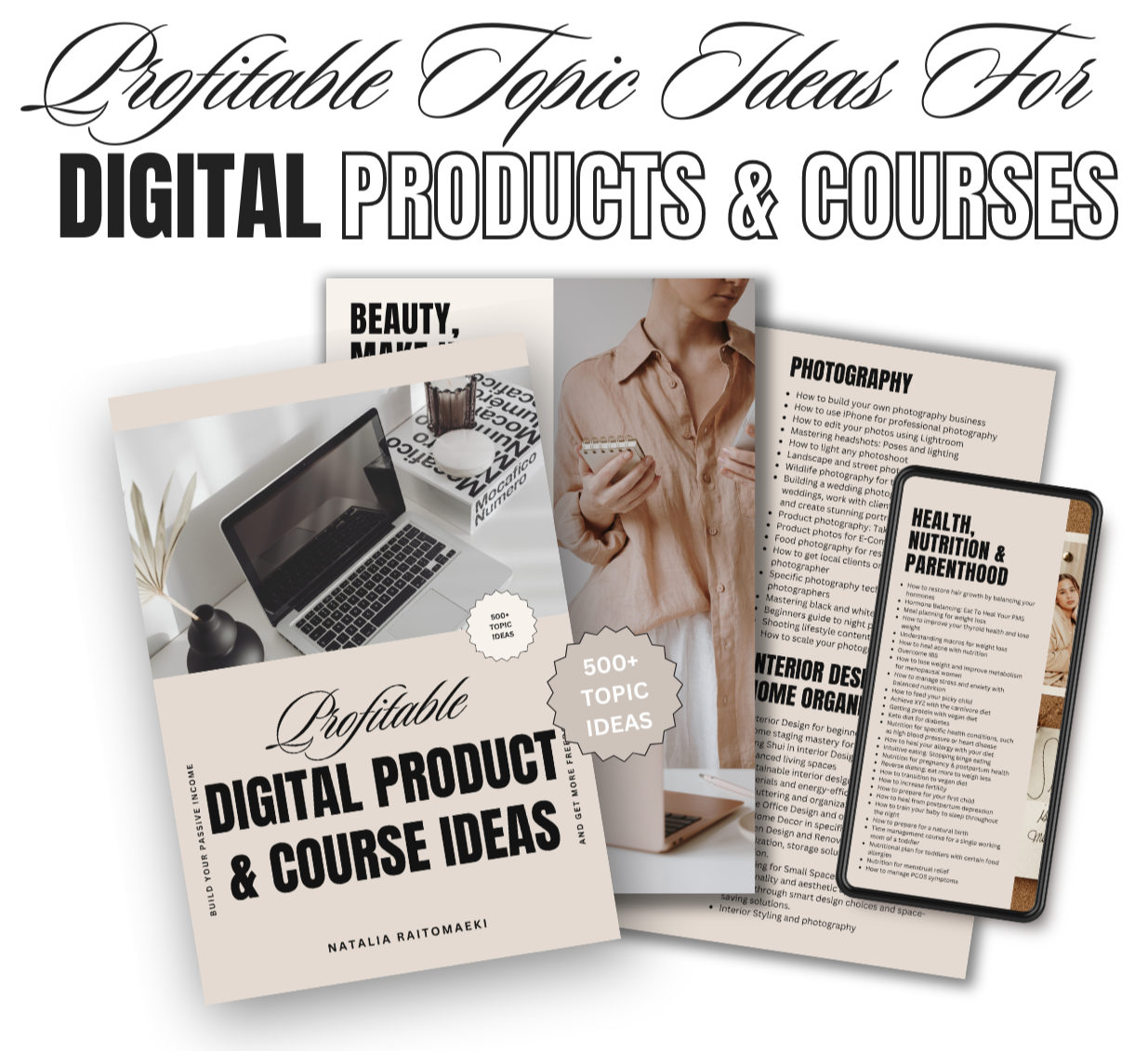 Free Guide with 500 profitable digital product topic ideas in different niches, inc. real estate, health, hormones, fitness, social media, home organizing, beauty, wedding, parenthood, mindset, career, cooking etc