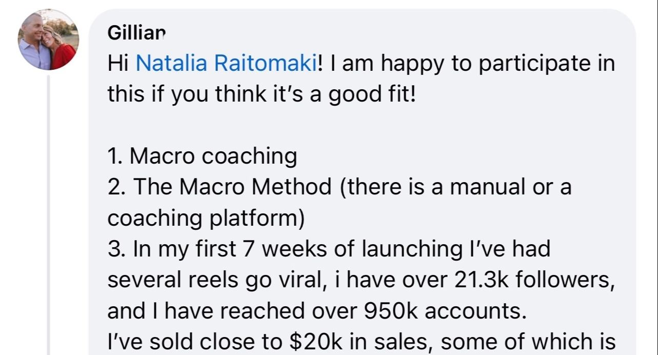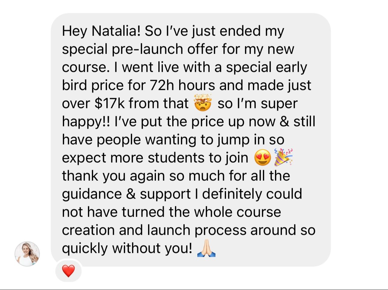 "I'm so grateful for Natalia's support and course. I've invested in other courses and only with Natalia's course and support I was able to create and launch my own digital aka online course successfully and my first launch ended up being $284k"