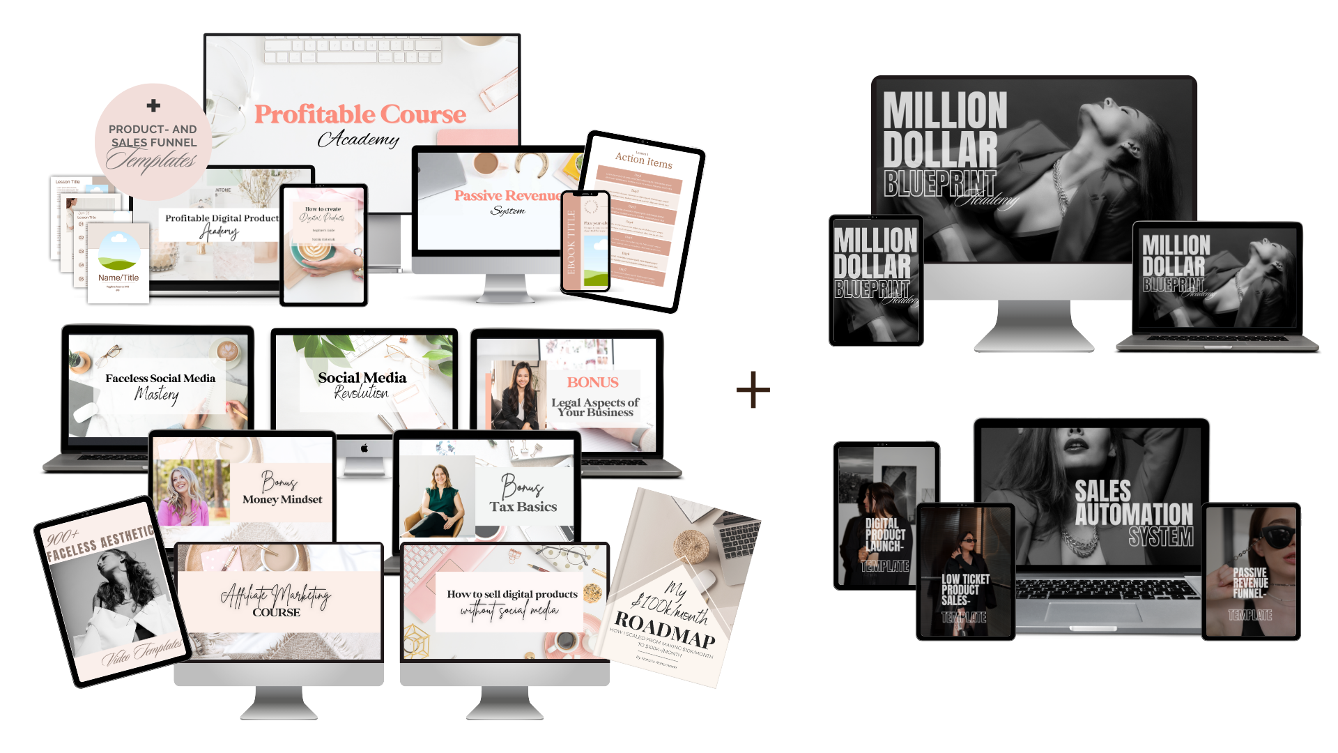 All-in-one shop with ALL step-by-step frameworks how to create and sell your own digital products and digital courses & how to automate your business for generating revenue from your digital products as passively as possible + *NEW* Million Dollar Blueprint Course & Sales Automation System Course (with templates!) and Affiliate Marketing Courses + access to our affiliate marketing program (50% commission)